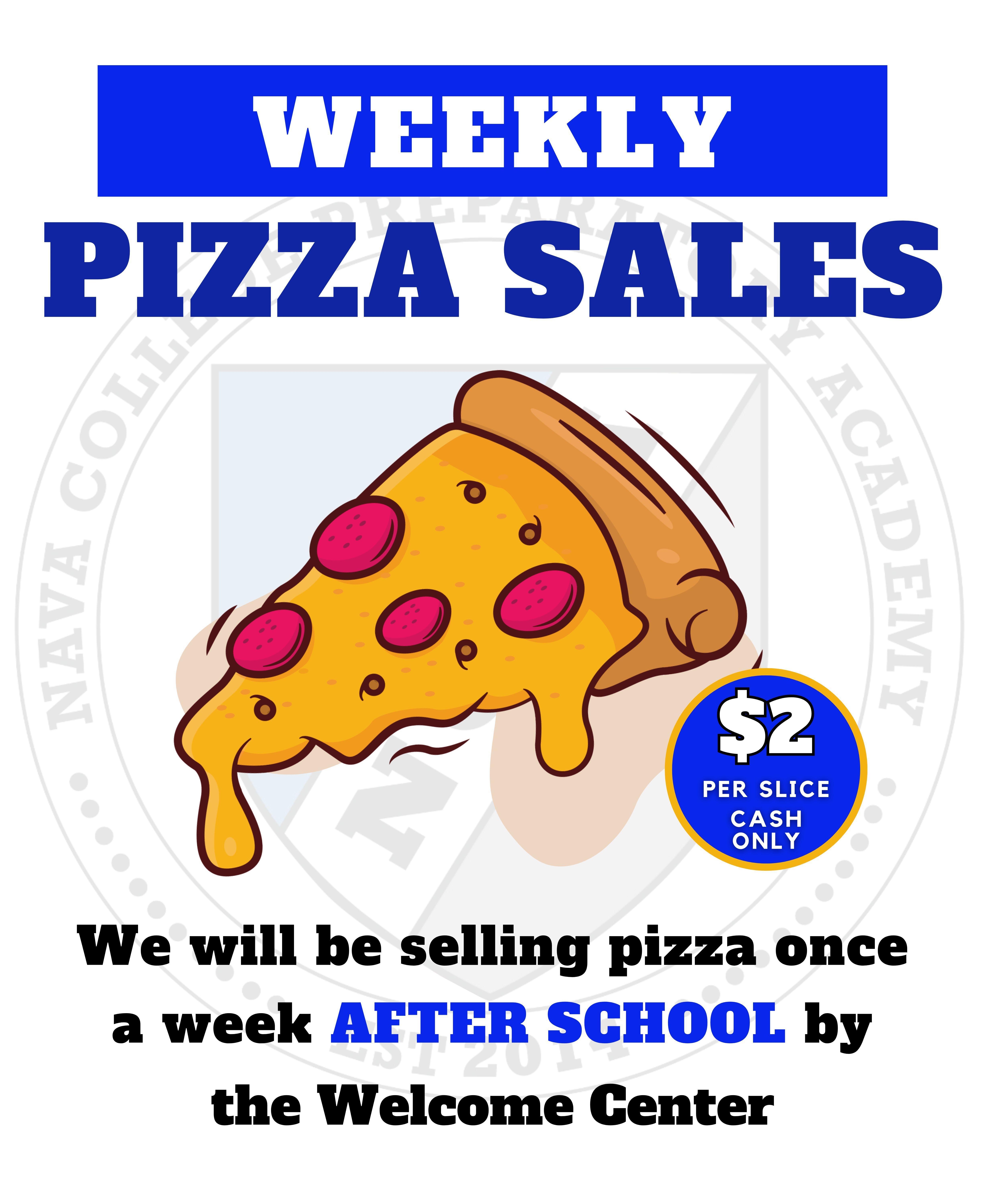 11/18: Pizza Sale (After School) We will be selling pizza on Tuesday AFTER SCHOOL by the Welcome Center. $2 per slice (cash only). Estaremos vendiendo pizza el martes DESPUÉS DE CLASES cerca del Centro de Bienvenida. $2 por porción (solo en efectivo). Attached Files Pizza Sales.pdf Print