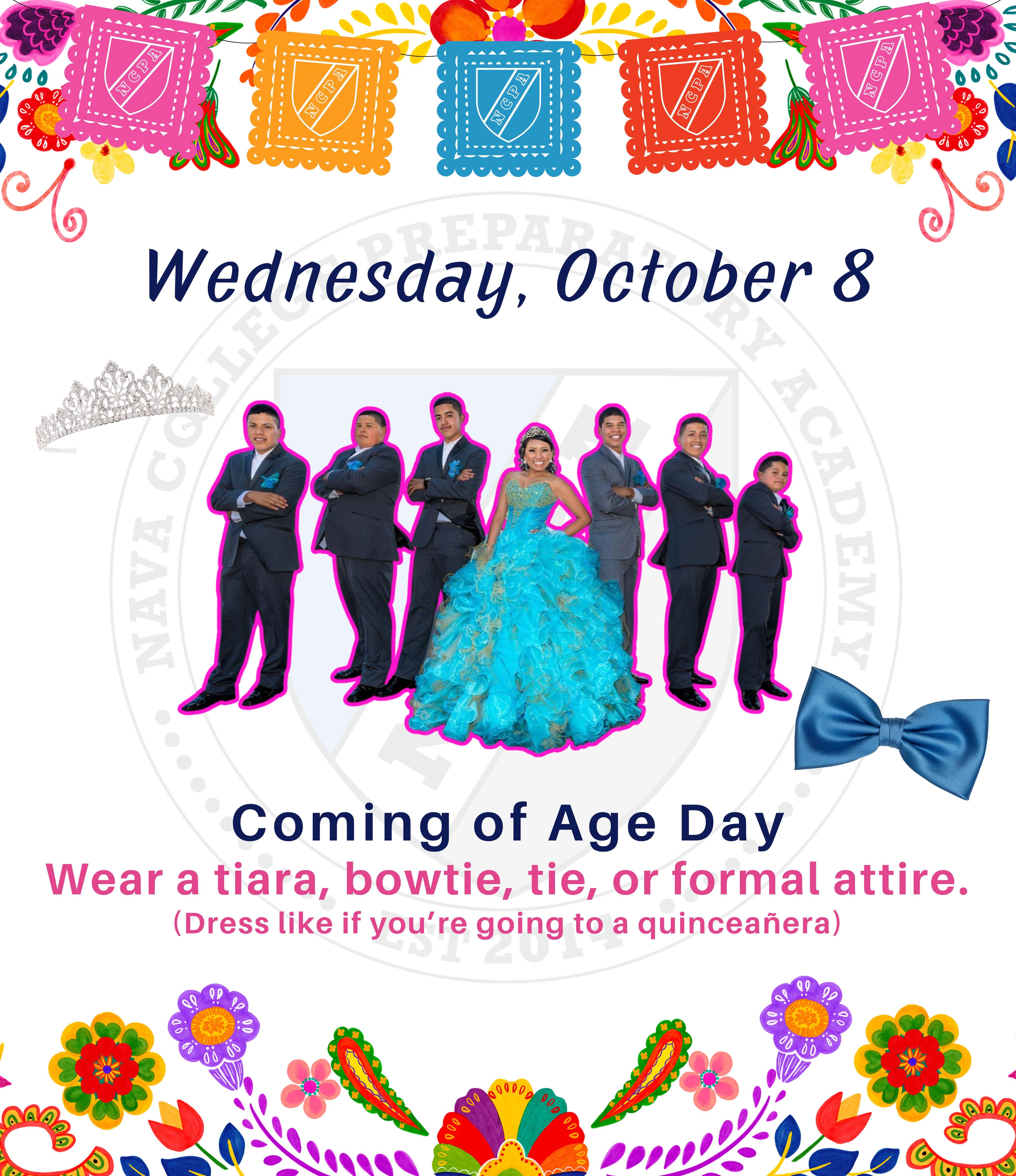 - Day #3: Wednesday, 10/08 - Coming of Age Day: Wear a tiara, bow tie, tie, or formal attire. Dress like if you're going to a quinceañera.