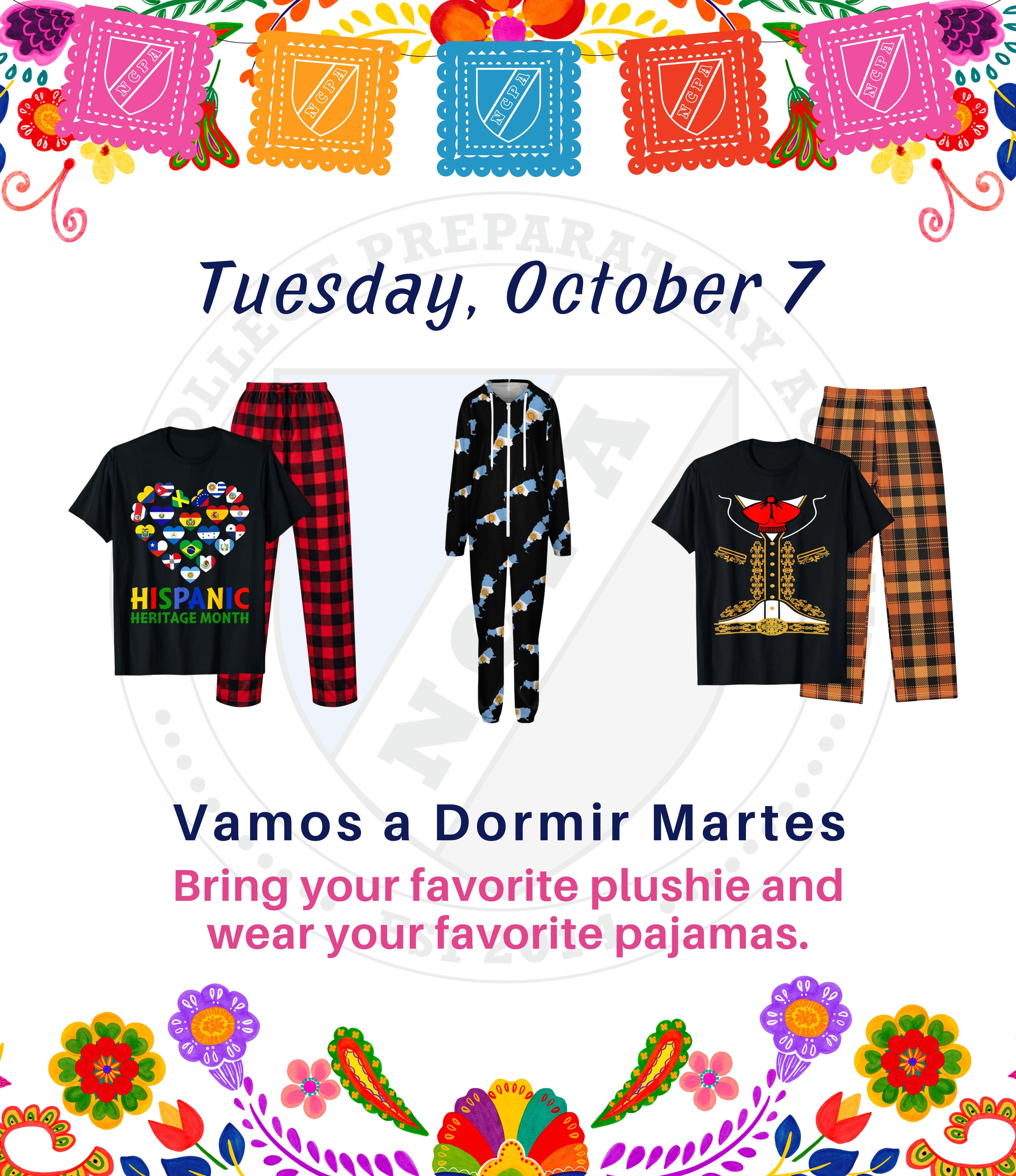 - Day #2: Tuesday, 10/07 - Vamos a Dormir Martes: Bring your favorite plushie and wear your favorite pajamas.
