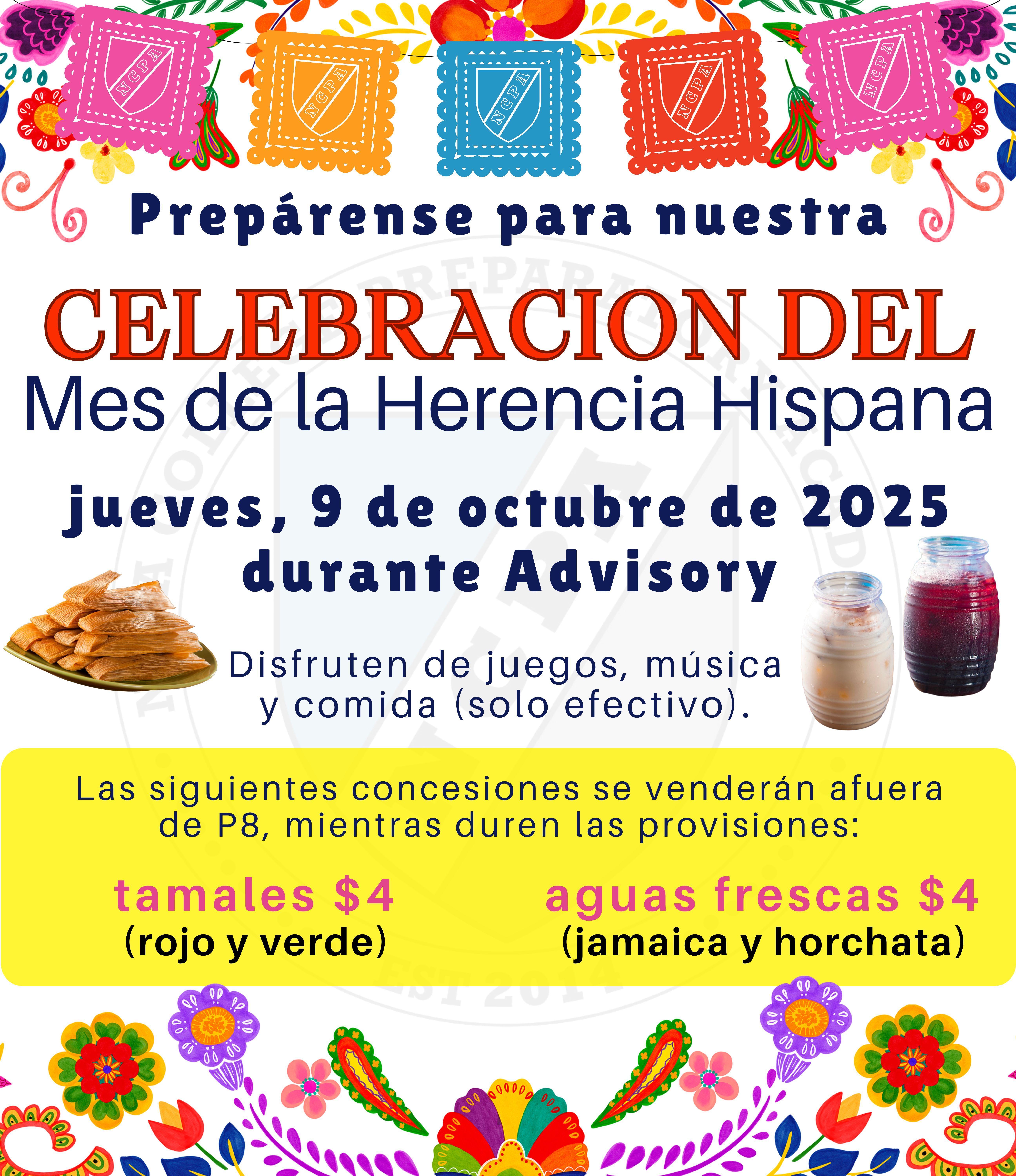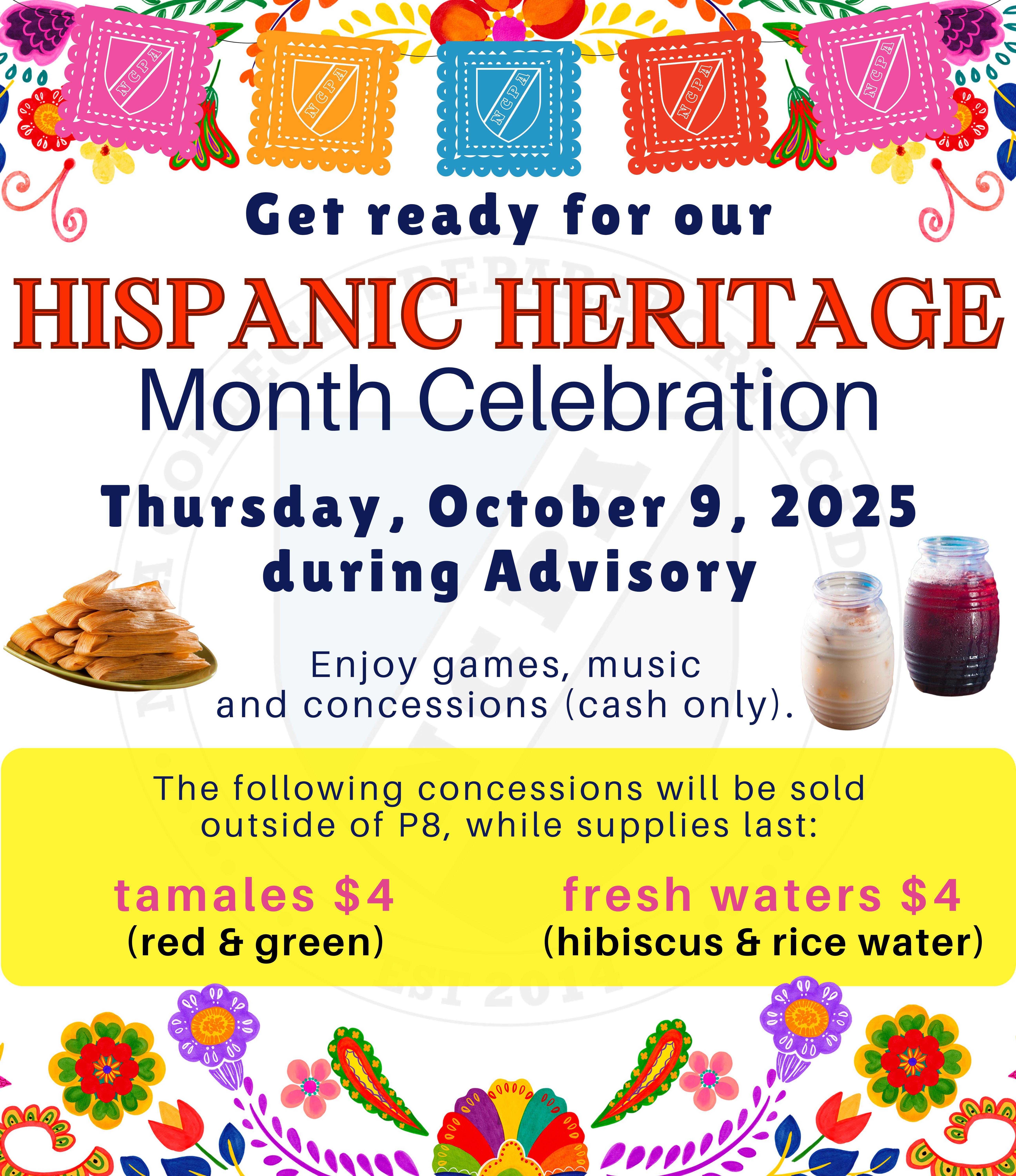 Our Hispanic Heritage Month Celebration is on Thursday, October 9, 2025 during Advisory. During the event we will be selling tamales (red & green) for $4 each and fresh waters (hibiscus & rice water) for $4 each. Cash only. We can't wait to celebrate together!