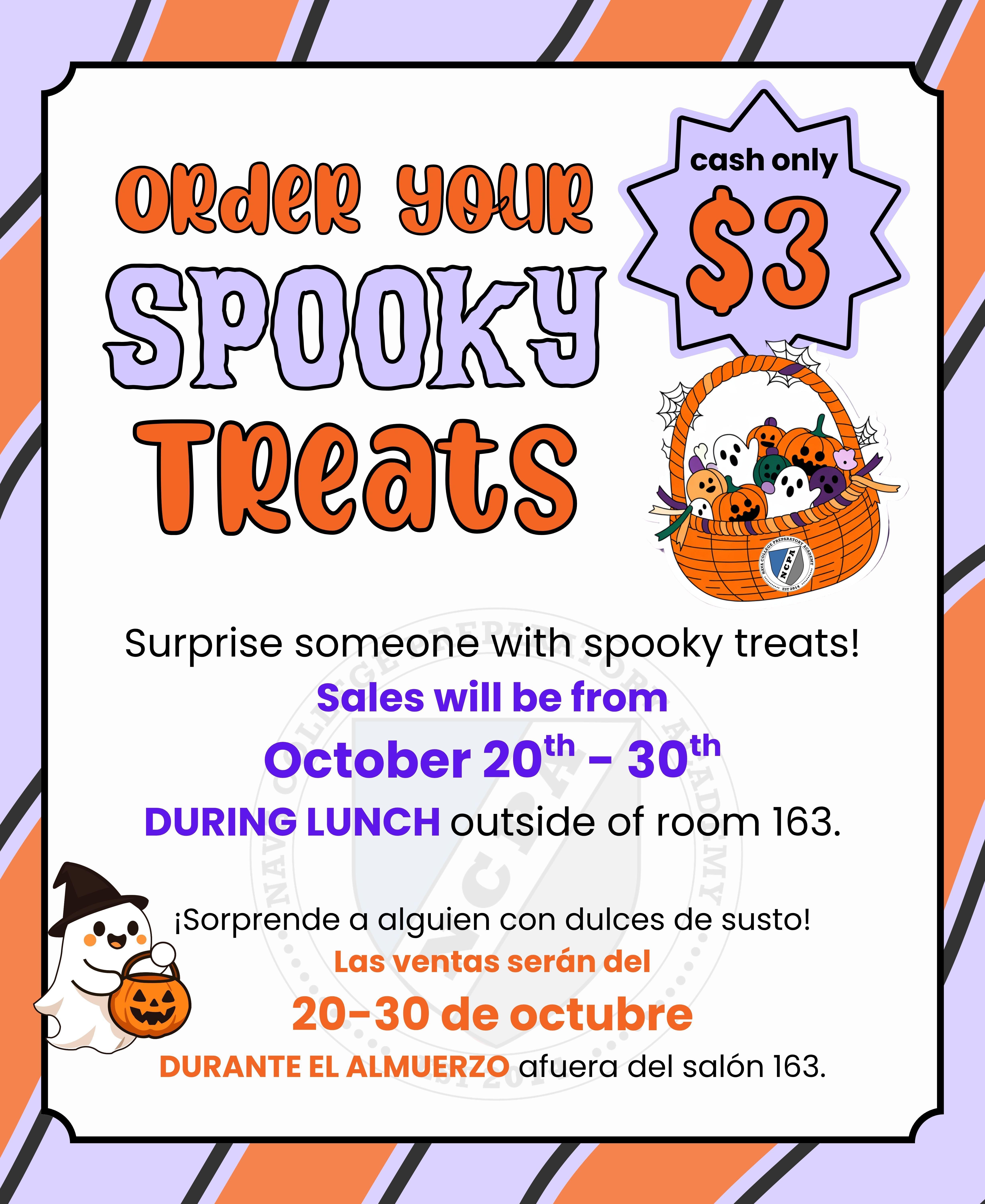 ¡No olviden de ordenar sus dulces de susto fuera del salón 163 durante el almuerzo! $3 (solo en efectivo)