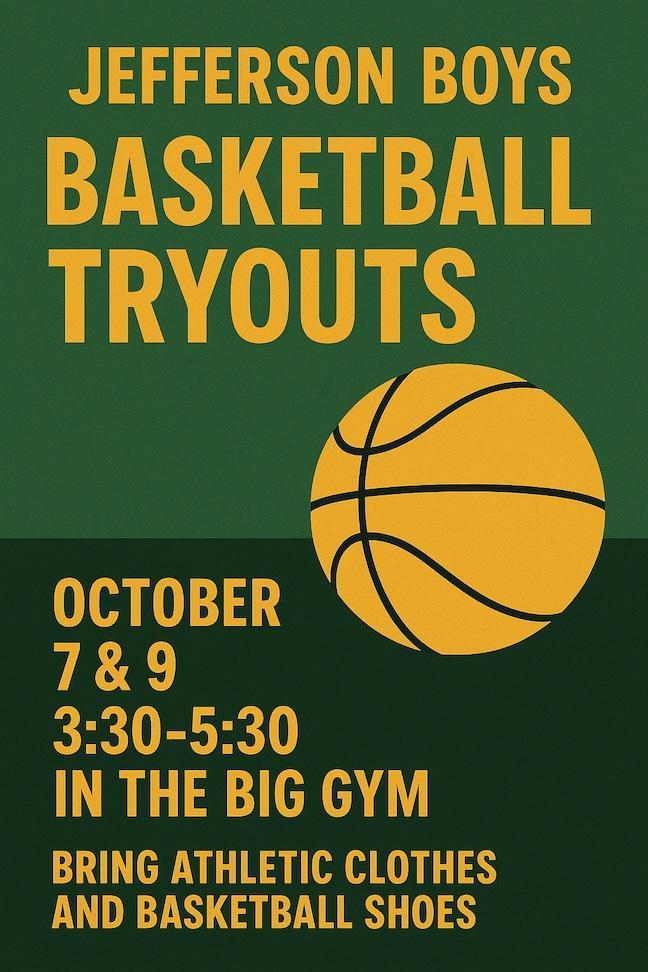 Boys' basketball tryouts will be on October 7th and 9th, after school, from 3:30 p.m. - 5:30 p.m. in the big gym. Make sure to bring athletic clothes and basketball shoes!