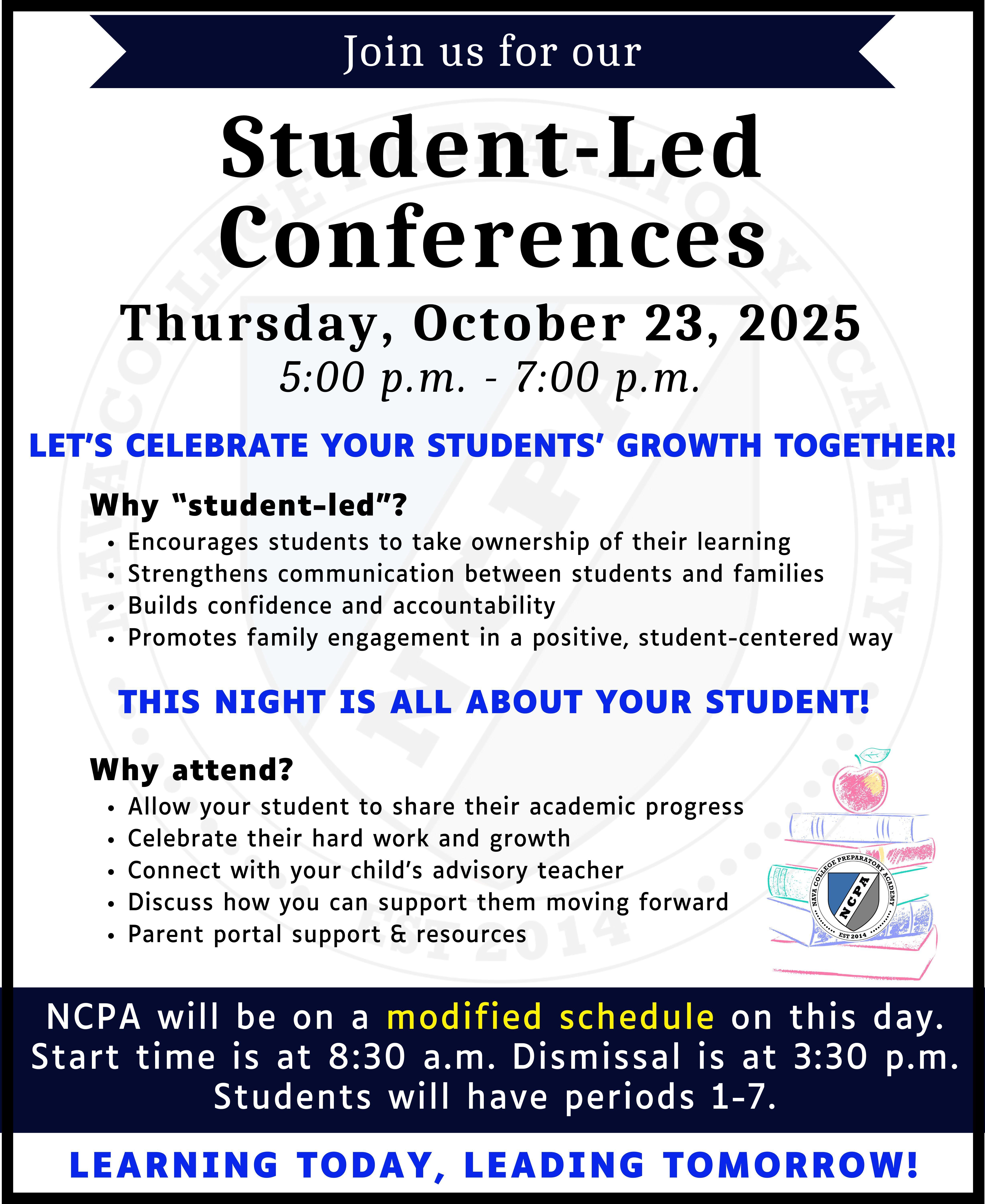 Let's celebrate your students' growth together! Join us for Student-Led Parent Conferences on Thursday, October 23, 2025 from 5:00 p.m. - 7:00 p.m. This is your student's chance to share their hard work, academic progress, new goals! Families will be able to connect with their child's advisory teacher and receive parent portal support and other resources. We'll see you there!