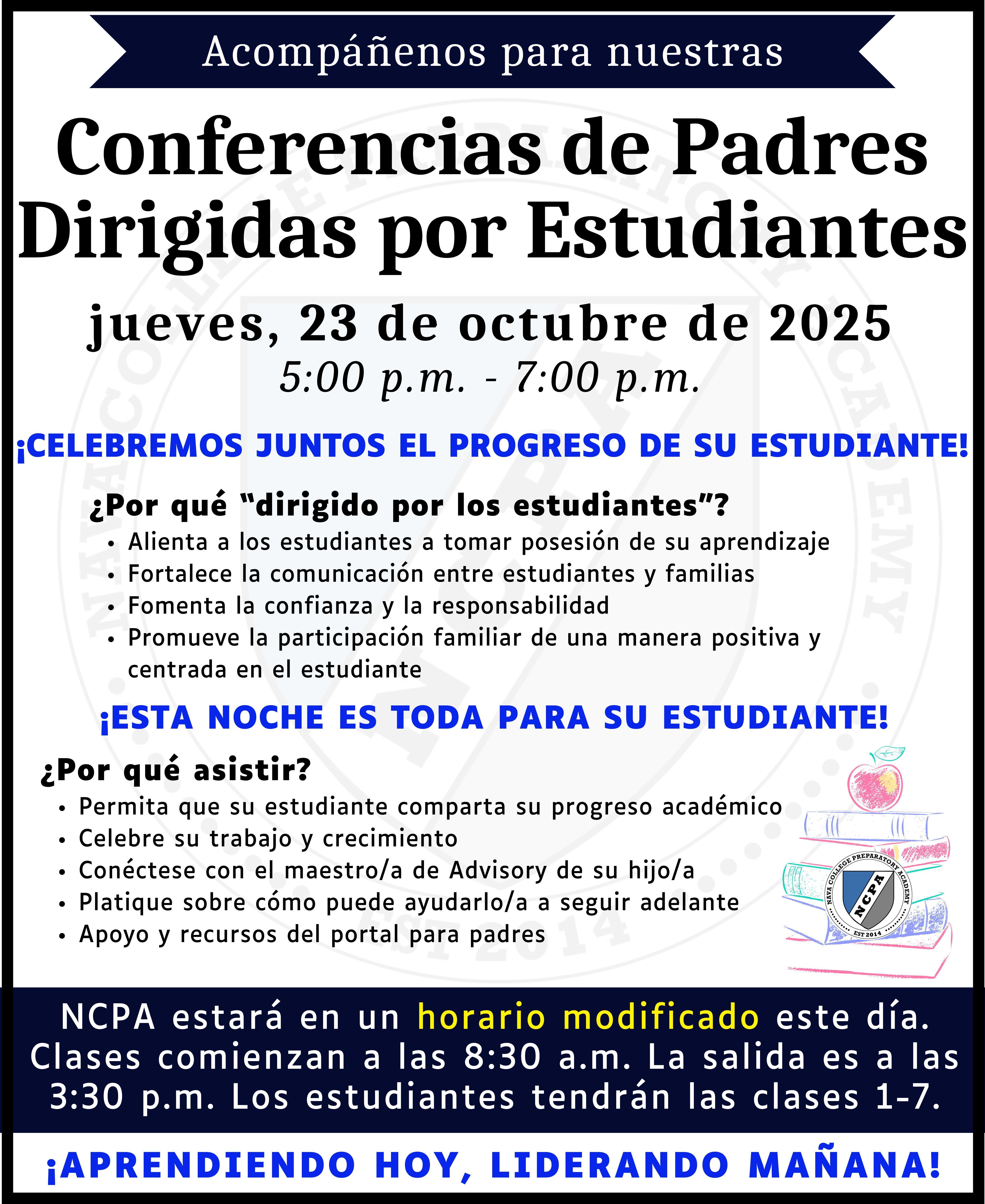 ¡Celebremos juntos el progreso de su estudiante! Acompáñanos para las Conferencias de Padres Dirigidas por Estudiantes el jueves, 23 de octubre de 5:00 p.m. - 7:00 p.m. ¡Esta es la oportunidad para que su estudiante comparta su arduo trabajo, su progreso académico y sus nuevas metas! Las familias podrán conectarse con el maestro/a de Advisory de su hijo/a y recibir apoyo con el portal para padres y otros recursos. ¡Nos vemos allí!
