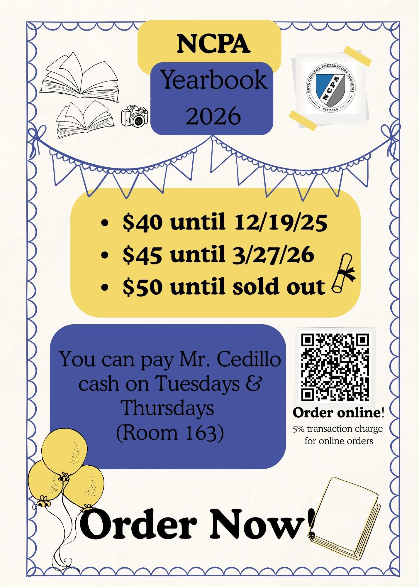 Knights, order your yearbook with Mr. Cedillo in room 163 on Tuesdays and Thursdays!