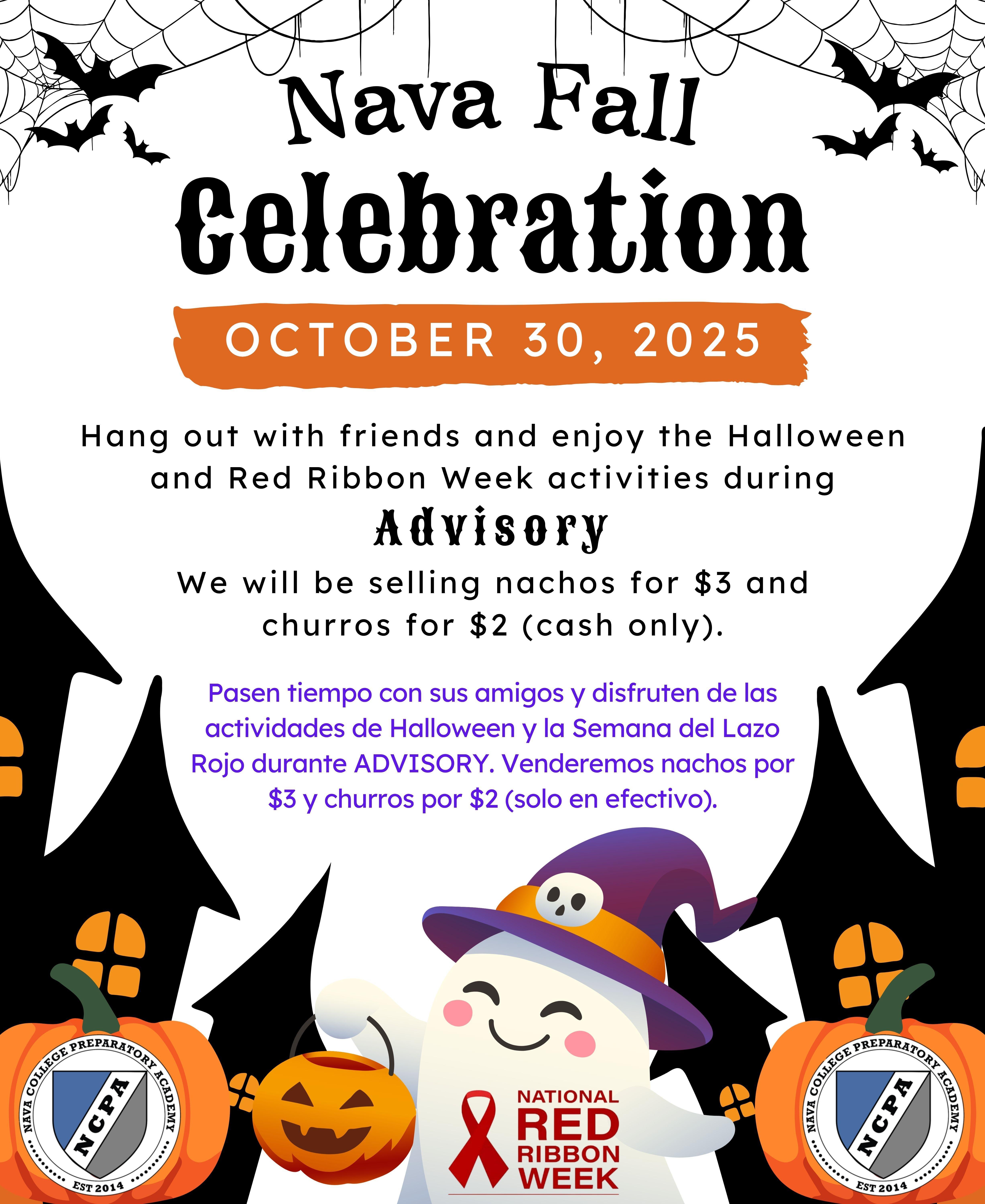 Enjoy the Halloween and Red Ribbon Week activities during Advisory on Thursday, October 30, 2025. We will be selling nachos for $3 and churros for $2 (cash only). Make sure to join to scavenger hunt!