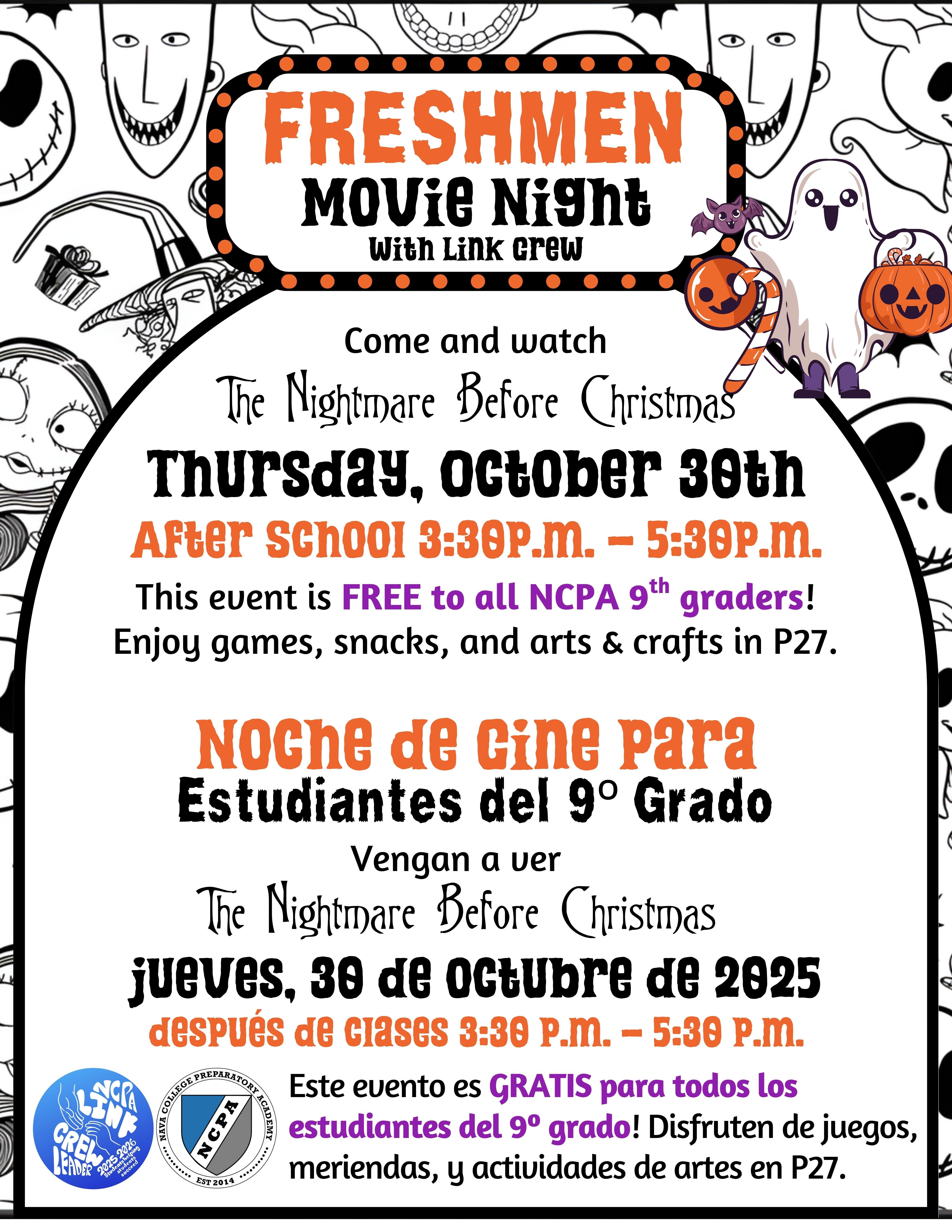 Este evento es GRATIS para todos los estudiantes del 9º GRADO el jueves, 30 de octubre de 3:30 p.m. - 5:30 p.m. en el salón P27. Disfruten de juegos, meriendas, y actividades de artes y vean The Nightmare Before Christmas.