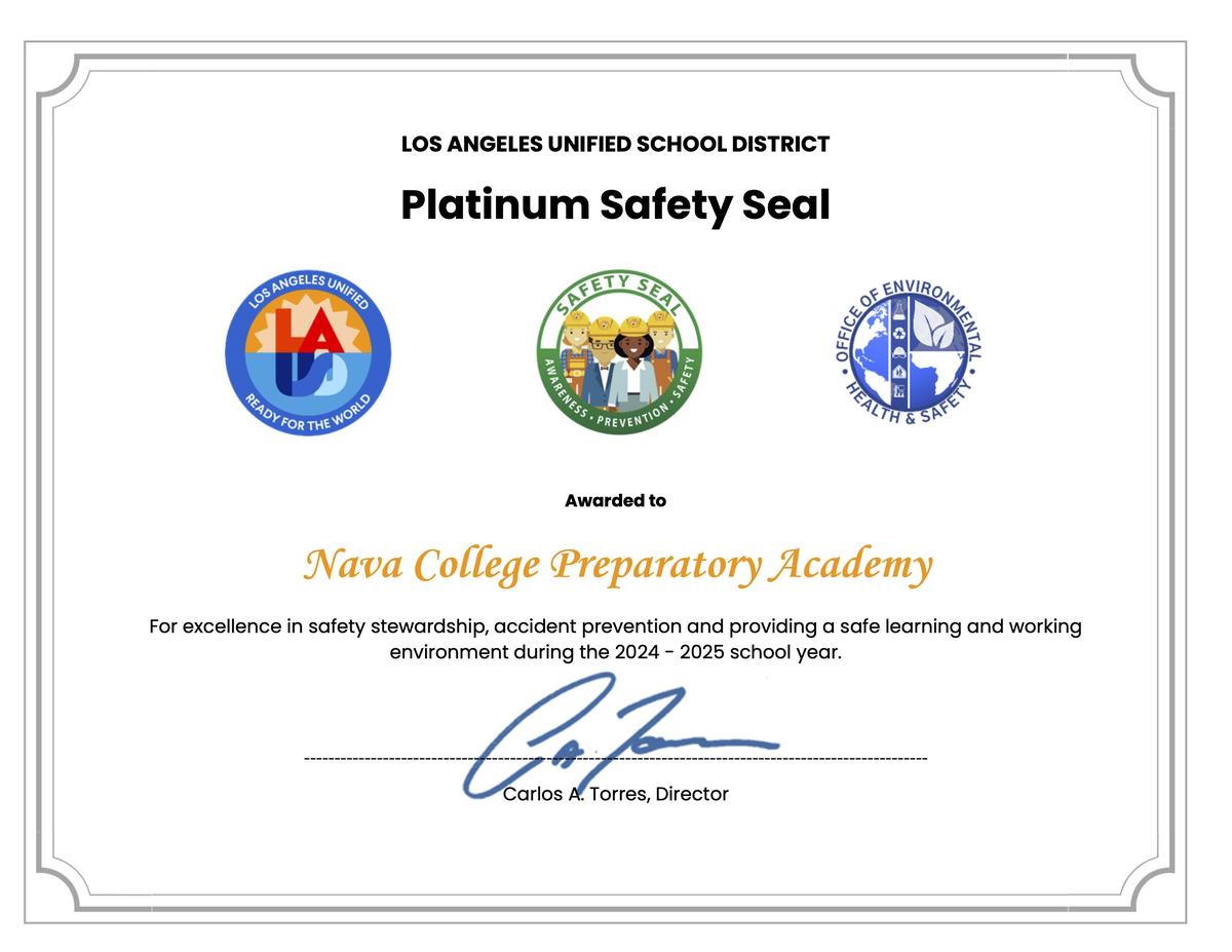 Nava College Preparatory Academy has earned the Platinum Safety Seal Award, recognizing our ongoing commitment to safety stewardship, accident prevention and providing a safe learning and working environment. Together, we'll continue building on this foundation - ensuring Nava remains a safe place where every student can thrive.