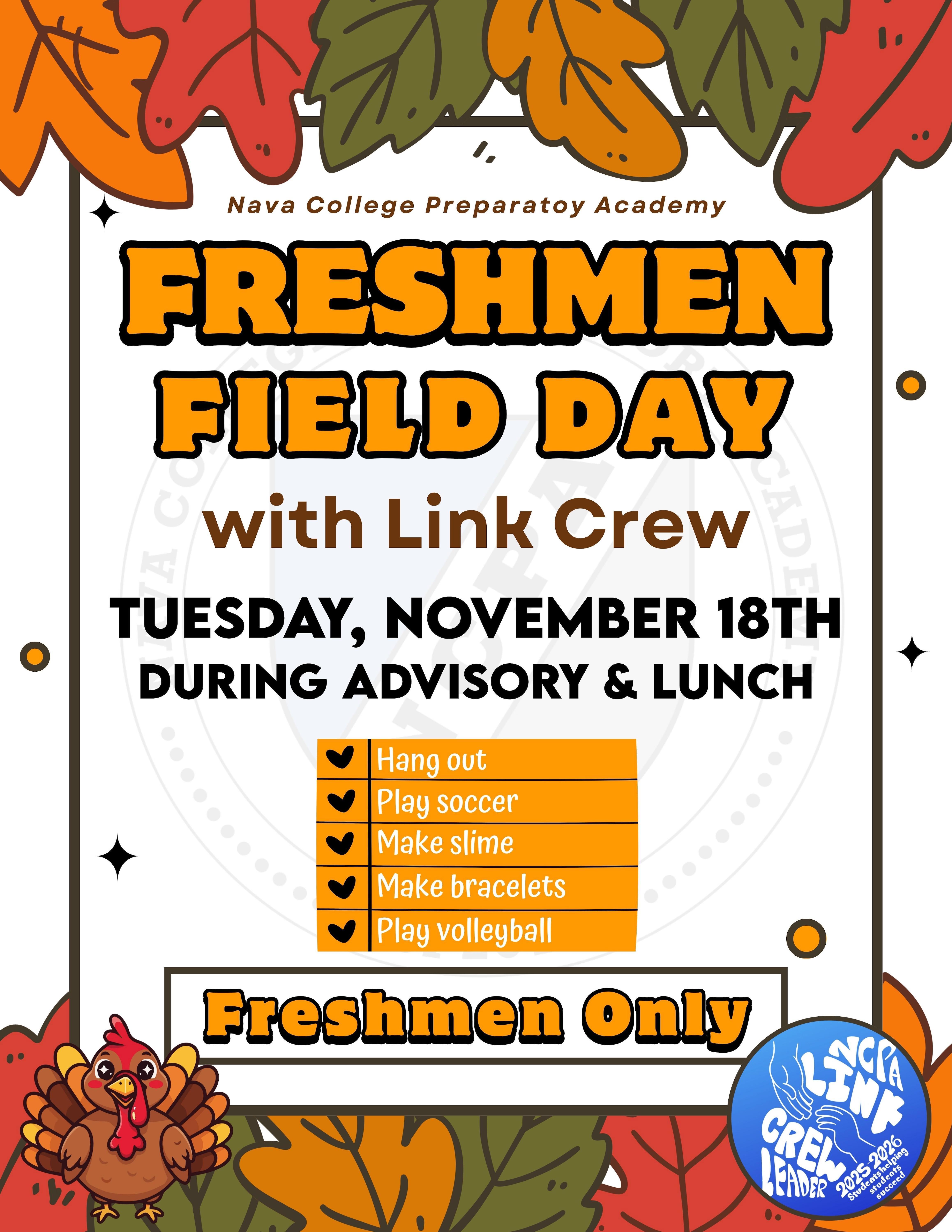 ¡Estudiantes del 9º grado, únanse con Link Crew para el Día de Campo de Primer Año el martes, 18 de noviembre durante advisory y el almuerzo! ¡Vengan a pasar el rato con Link Crew, jugar fútbol, hacer slime y mucho más! ¡SOLO PARA ESTUDIANTES DE PRIMER AÑO! No olviden compartir sus recomendaciones de musica.