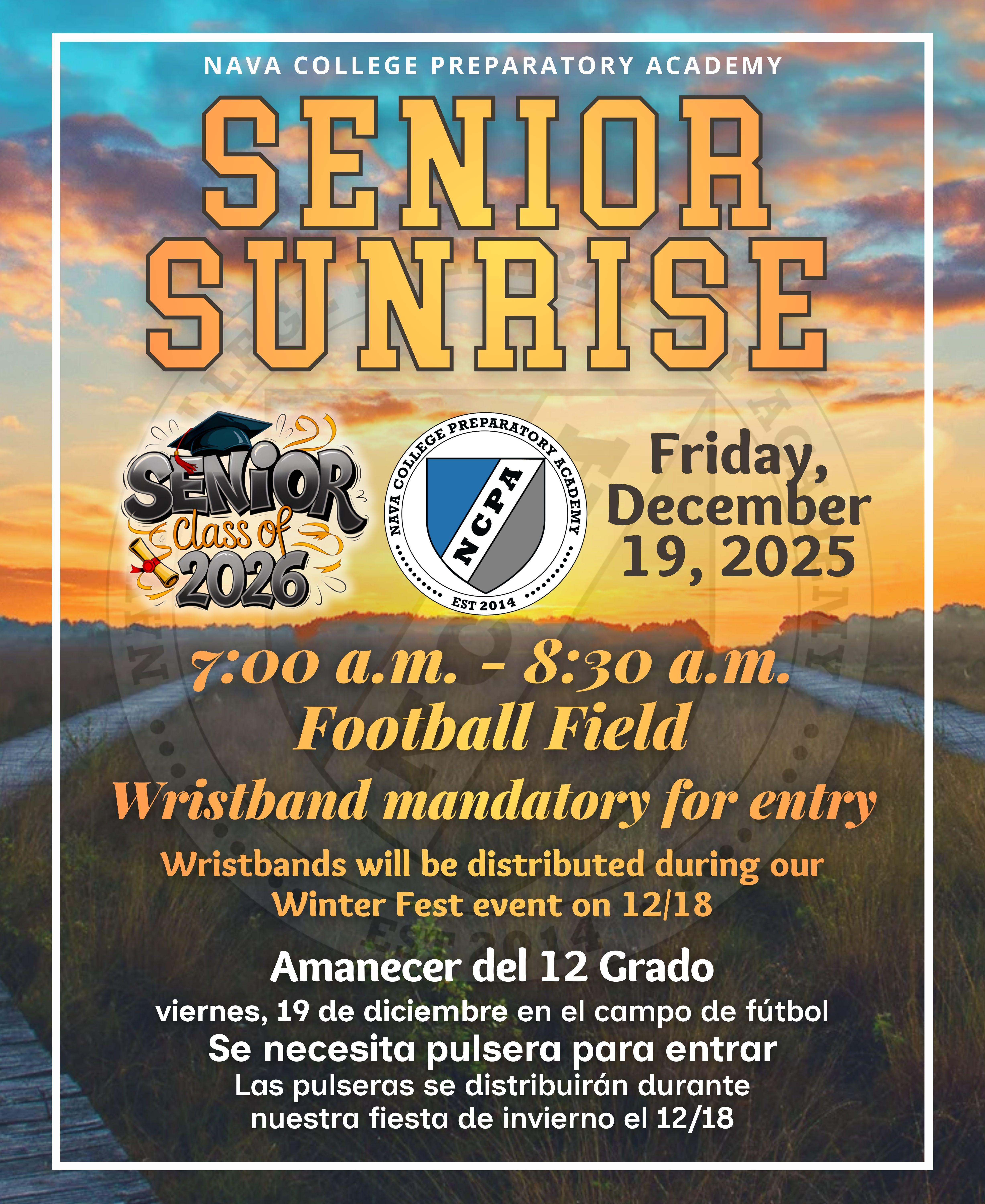 El Amanecer del 12 Grado se llevará a cabo el viernes, 19 de diciembre de 7:00 a.m. - 8:30 a.m. ¡Usen sus pijamas favoritas, traigan sus cobijas calientitas y disfruten del amanecer con sus amigos! Recojan sus pulseras durante la Fiesta de Invierno el 12/18 (durante advisory). Es REQUERIDO presentar su pulsera para entrar. Si salen del evento, no se permitirá entrar de nuevo. Si tienen alguna pregunta, hablen con la Sra. Fedurek en el salón P27.
